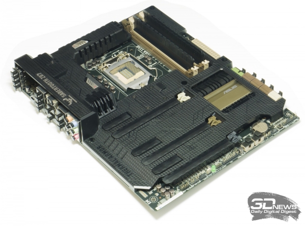 Причина этого находится буквально на поверхности, точнее говоря, над поверхностью самой платы — пластиковая броня, обеспечивающая особый микроклимат для особых компонентов. Полевые транзисторы, дроссели и конденсаторы, решившие связать свою судьбу с черным текстолитом саблезубой, прошли жесточайший отбор и будут с ней до нескорого конца. Если бы мы решили всерьез проверить ее жизнестойкость, то к моменту выхода статьи вы бы, вероятно, собирались сменить свой Broadwell на Haswell-E и не стали бы читать материал. Так что в этом вопросе доверимся ASUS.