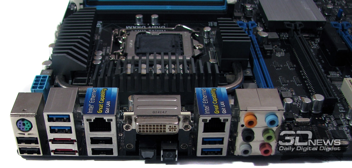 Несмотря на поддержку встроенной графики, разработчики установили всего один (наиболее востребованный) порт DVI. Логику инженеров понять можно: остальные порты (такие как VGA и HDMI) вряд ли будут задействованы в вычислительных рабочих станциях. В результате сэкономленное место было отведено под размещение кнопки USB BIOS Flashback (запускает одноименную функцию восстановления прошивки BIOS) и оптический S/P-DIF выход. Остальное место на панели предназначено для многочисленных USB-портов, пары портов eSATA, аудиоразъемов и порта PS/2. Что касается COM-порта, то он, как и порт FireWire, реализован через планку, которая есть в комплекте.