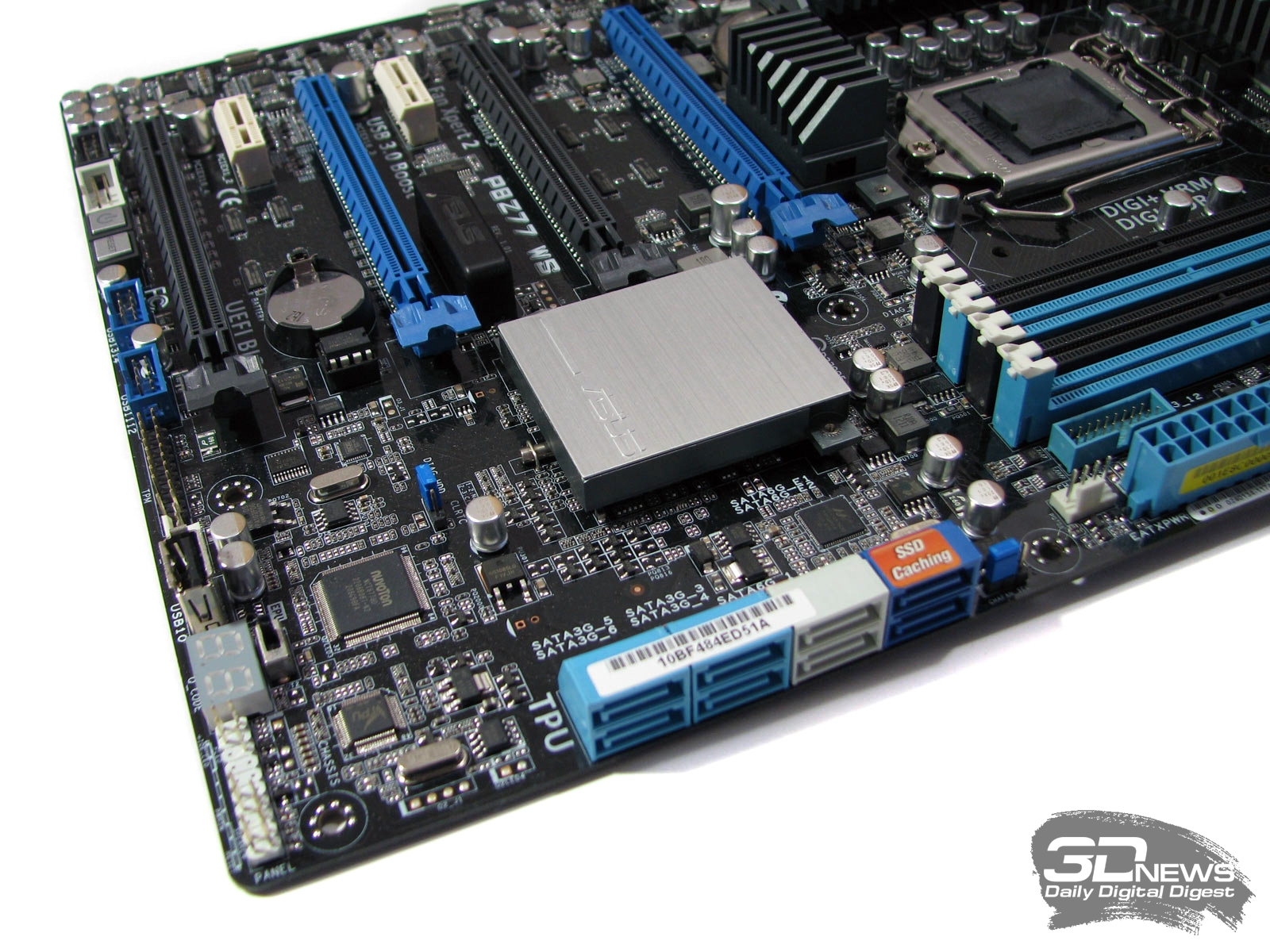Плата ASUS P8Z77 WS, благодаря чипсету Z77, поддерживает четыре канала SerialATA 3 Gb/s и пару каналов SerialATA 6 Gb/s. Все порты расположены около чипсета и ориентированы параллельно плоскости платы. При этом порты 6 Gb/s окрашены в белый цвет, а порты 3 Gb/s светло-синие.