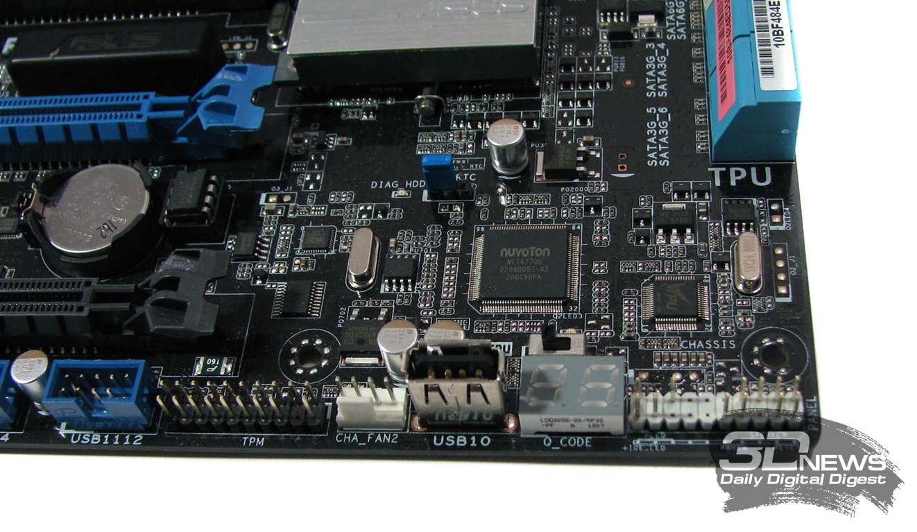 Рядом с этой кнопкой установлен переключатель функции TPU, которая отвечает за автоматический разгон процессора. Похожий переключатель предназначен для активации функции EPU (управление питанием и энергосбережением) — он расположен около семисегментного индикатора POST-кодов. Последний можно использовать для самостоятельной начальной диагностики системы, причем коды всех нештатных ситуаций имеют расшифровку в руководстве пользователя.