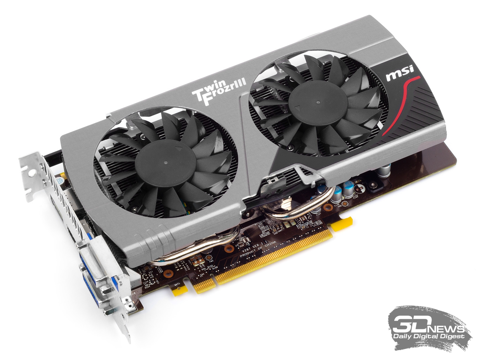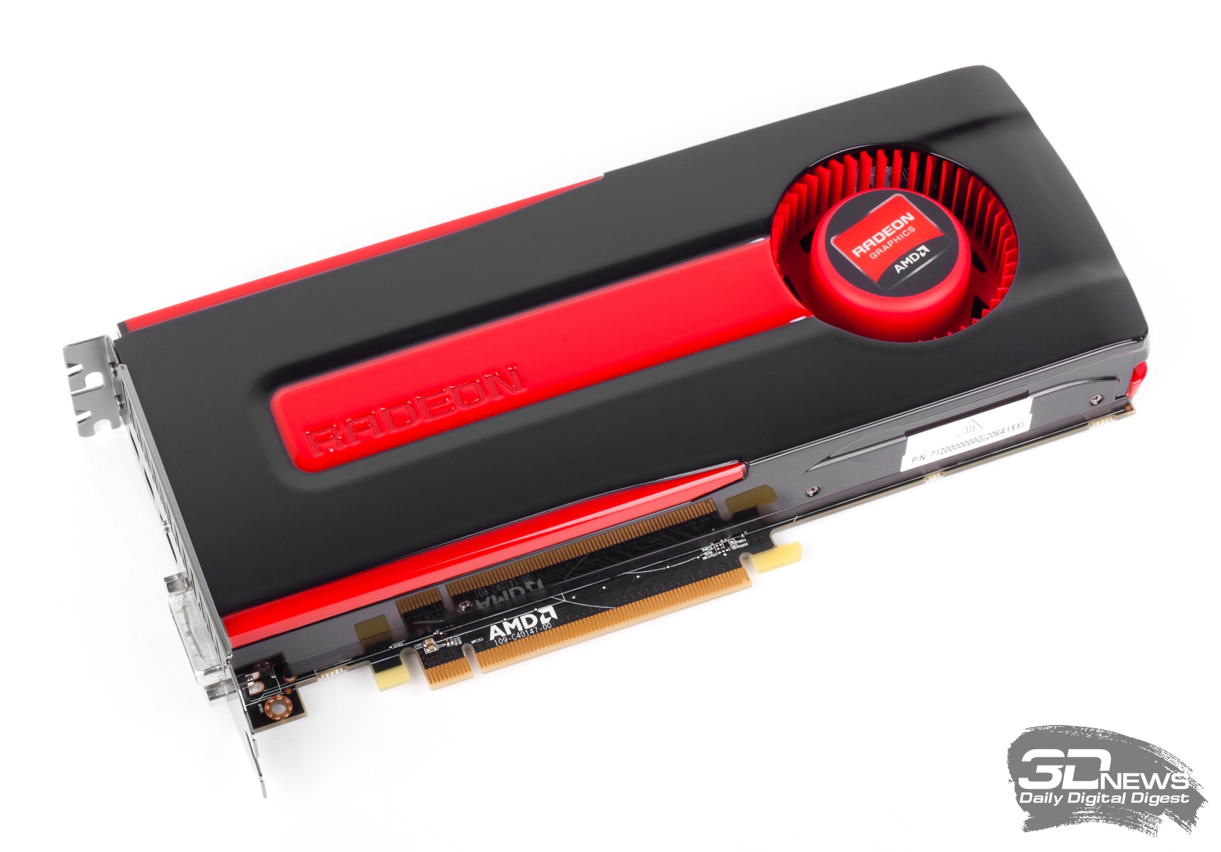 Это на сто процентов референсный видеоадаптер, предоставленный самой компанией AMD. Соответственно, частоты ядра и памяти с точностью до мегагерца соответствуют эталонным. В отличие от всех остальных участников тестирования, референсный Radeon HD 7850 оснащен турбинным кулером. Радиатор имеет медную подошву и пронизан тремя тепловыми трубками.