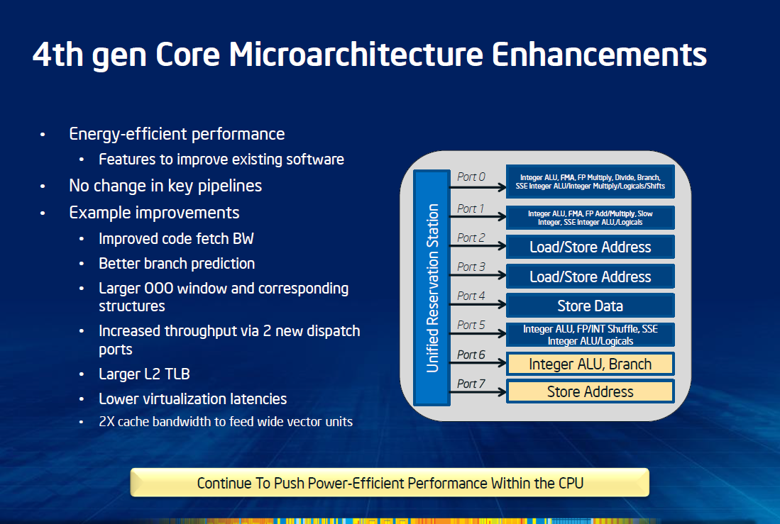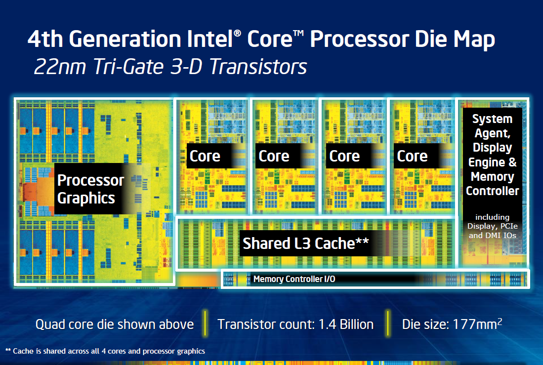 В состав четырёхъядерного кристалла Haswell, ориентированного на использование в настольных процессорах, то есть располагающего «средним» встроенным графическим ядром GT2, входит 1,4 миллиарда транзисторов, а его площадь равна 177 кв.мм. Аналогичный кристалл Ivy Bridge был проще всего на 15 процентов, в него входило 1,2 миллиарда транзисторов (подчеркнём, в обоих случаях речь идёт о схемотехнической сложности, не учитывающей дублирование на кристалле некоторых полупроводниковых элементов). Половина добавившегося транзисторного бюджета израсходована на графику, доля которой в процессорном кристалле дошла до 30 процентов, так что на микроархитектурные преобразования процессорных ядер остаётся всего ничего.