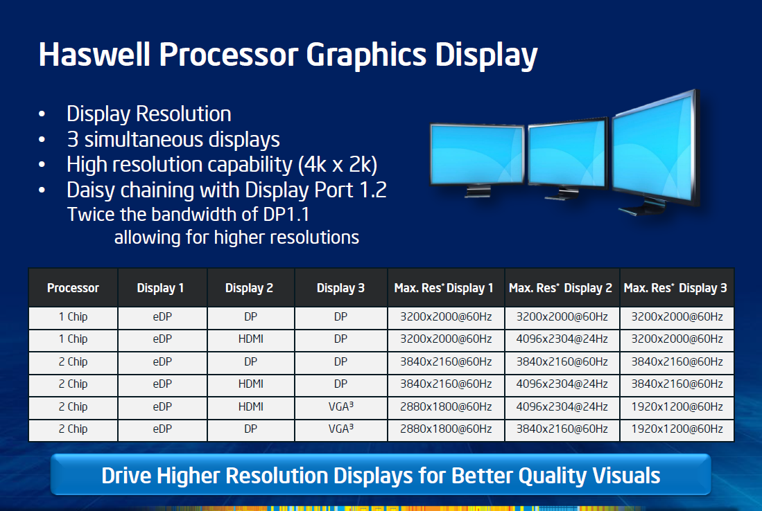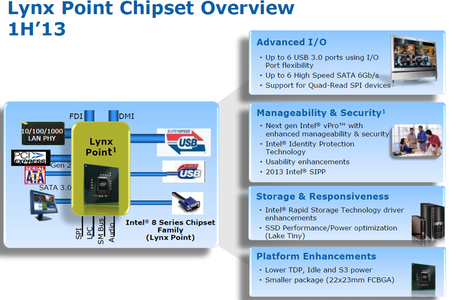 Например, Intel переработала схему подключения мониторов к интегрированному в процессор графическому ядру. Теперь за цифровые интерфейсы Display Port, HDMI и DVI отвечает сам CPU, а в чипсете осталась лишь поддержка аналоговых VGA-подключений. Такое решение существенно разгрузило графическую FDI-шину между процессором и набором системной логики и позволило реализовать в платформе Lynx Point одновременную поддержку трёх цифровых мониторов, работающих с 4K-разрешениями.