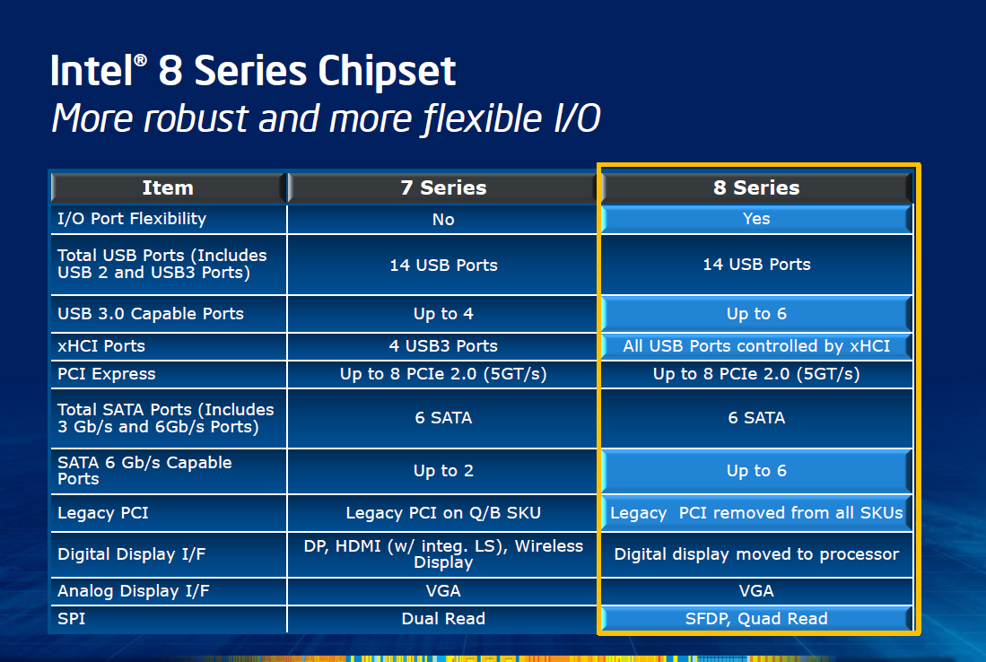 Куда более заметными нововведениями может похвастать новая десктопная платформа Lynx Point, сопровождающая появление процессоров Core четвёртого поколения. Так уж исторически сложилось, что с релизом каждой новой процессорной микроархитектуры компания Intel выводит на рынок и новое поколение наборов системной логики. Некоторые чипсеты сохраняют совместимость с предыдущими поколениями процессоров, как, например, было в случае с сериями Z68 и Z77, а некоторые всякую совместимость отвергают. В целом Intel старается придерживаться правила, что выход принципиально новых микроархитектур, относящихся к циклу разработки «так», сопровождается полным обновлением платформы и всей инфраструктуры. Именно это и произошло в сегодняшнем случае.