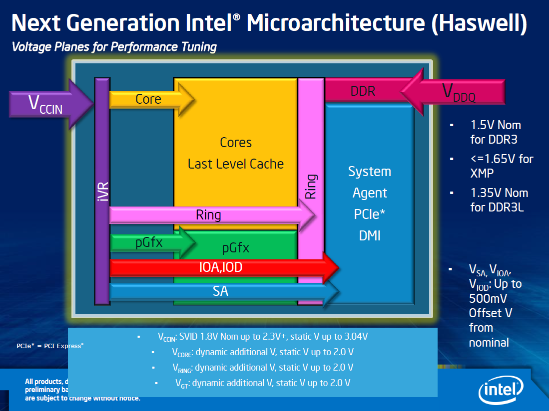 Такая интеграция не только позволяет процессору лучше контролировать ситуацию с динамическим питанием и энергосбережением, но и упрощает конструкцию LGA1150-материнских плат, которые освобождаются от дополнительных силовых схем. В итоге выиграть должны все. Производители системных плат смогут облегчить дизайн своих продуктов. Процессоры будут более рационально использовать электроэнергию. А пользователи получат единую, надежную, стабильную и точную систему для управления напряжениями, не зависящую от конкретной реализации. Intel обещает очень высокую аккуратность встроенного преобразователя: вызванные различными физическими причинами флуктуации напряжения не должны превышать единиц милливольт. Но самое главное, гибкость и управляемость этой системы не ухудшится: привычный энтузиастам полный доступ к параметрам встроенного в процессор преобразователя питания будет сохранён.