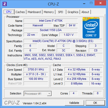 Максимальная частота, до которой разгоняется Core i7-4770K благодаря технологии Turbo Boost, — 3,9 ГГц. Она достижима при нагрузке на одно или два вычислительных ядра. С тремя загруженными ядрами максимальная частота равна 3,8 ГГц, а полная 100-процентная нагрузка позволит этому процессору авторазогнаться до 3,7 ГГц. При простое же Core i7-4770K сбрасывает свою частоту до 800 МГц, что вдвое ниже, чем умели процессоры прошлого поколения.