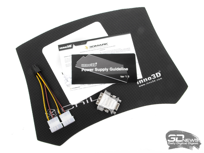 Видеокарта поставляется в аскетичной и компактной коробке с небольшим комплектом аксессуаров, который включает бумажную документацию, переходник питания и адаптер DVI — VGA. Полезные дополнения — коврик для мыши и карточка с ключом для активации последней версии теста 3DMark.
