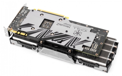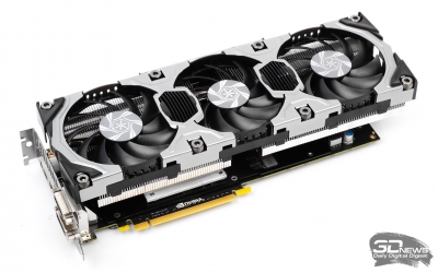 Главный предмет гордости этой видеокарты — фирменная система охлаждения колоссальных размеров HerculeZ 3000, которую Inno3D устанавливала на свои карты GeForce еще в 600-й серии. Мало того что кулер занимает три слота, так еще и выпирает за границы печатной платы на конце, противоположном заглушке, в результате чего длина устройства достигает 30 см. Работу по перемещению воздуха сквозь радиаторные ребра выполняют три крупных вентилятора типоразмера 92 мм.