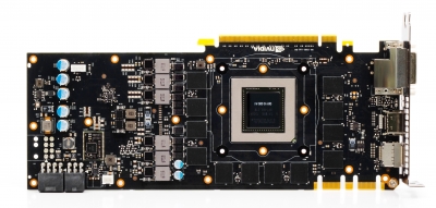 Сама печатная плата Inno3D GeForce GTX 780 iChill HerculeZ 3000 на вид также идентична референсной PCB, только маркировка на нашем экземпляре GTX 780 от NVIDIA набрана другим шрифтом, что не удивительно для инженерного образца. А в остальном все то же самое. GPU питается по шестифазной схеме от регулятора напряжения ON Semiconductor NCP4206. Еще две фазы отвели для питания микросхем памяти. Сами чипы DRAM произведены Samsung и несут маркировку K4G20325FD-FC03, которая сообщает о штатной тактовой частоте 1500 (6000) МГц.