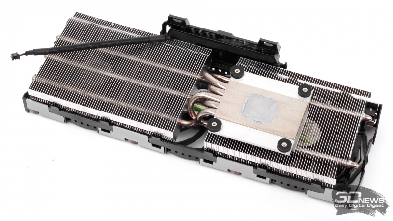 Радиатор системы охлаждения состоит из двух секций тонких алюминиевых ребер, нанизанных на пять теплотрубок. С кристаллом GPU контактирует медная подошва.