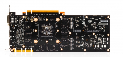Большая часть задней поверхности печатной платы покрыта толстой металлической пластиной, придающей конструкции дополнительную жесткость. Кусок металла соединяется с кожухом кулера на обратной стороне посредством боковой вставки с надписью iChill HerculeZ, которая подсвечивается белым светодиодом. Между прочим, к видеокарте зачем-то прилагается сменное стекло для этого компонента. Никакой информационной нагрузки, в отличие от индикатора на референсной плате GeForce GTX 780, светодиод нести не может, ибо он запитан от того же разъема, что и вентиляторы, а контакты, специально предназначенные для подсветки, на плате пустуют.